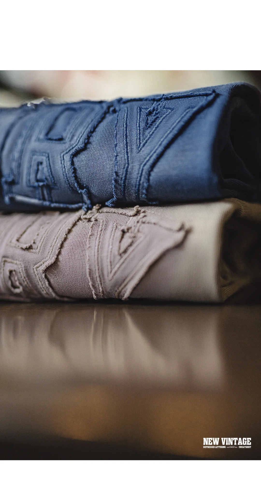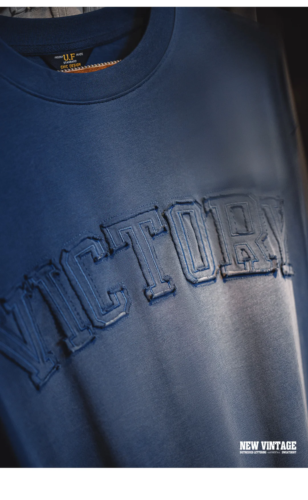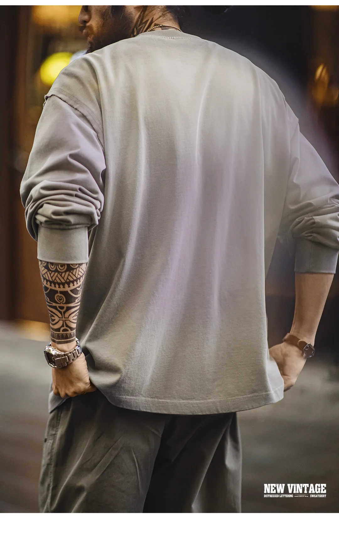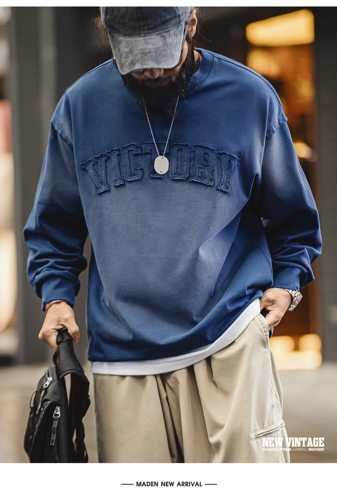 Maden Vintage Letter patched Gradient Colored Hoodie Loose Fit Washed Round Neck T-shirt for Men's Spring and Fall Casual Tops